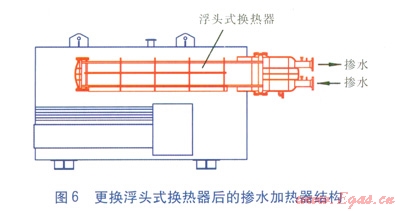 將原加熱盤管拆除(見圖4),更換成浮頭式換熱器(見圖5)。改造完畢后,按要求試壓。1臺摻水加熱爐安裝1臺浮頭式換熱器,另制造1臺浮頭式換熱器作為3臺摻水加熱爐的備用換熱器。當(dāng)某臺浮頭式換熱器結(jié)垢嚴重,需要清垢時,先停爐拆下該浮頭式換熱器,更換上備用換熱器,然后摻水加熱爐繼續(xù)運行,從而減輕對正常運行的影響。更換浮頭式換熱器后的摻水加熱器結(jié)構(gòu)見圖6。