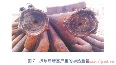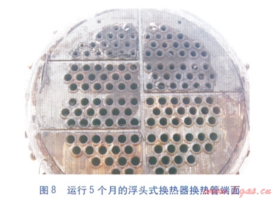 3臺摻水加熱爐于2012年10月陸續(xù)改造完成,并同期投產(chǎn)運行。改造后的3臺加熱爐運行情況基本平穩(wěn),直至2013年3月才陸續(xù)出現(xiàn)換熱效率低的現(xiàn)象。原加熱盤管基本兩個月就需要酸洗一次,酸液對金屬的腐蝕性強,易揮發(fā)產(chǎn)生酸霧污染原油,降低管道及設(shè)備的使用壽命[1]。而且隨著運行時間的延長,酸洗的次數(shù)增加,加熱盤管內(nèi)壁結(jié)垢傾向越來越嚴重,酸洗也變得無能為力。而改造后的浮頭換熱器能夠通過機械通洗繼續(xù)使用,清洗周期也比原加熱盤管有所延長。拆除后堵塞嚴重的加熱盤管見圖7,運行5個月的浮頭式換熱器換熱管端面見圖8。實踐充分證明,采用浮頭式換熱器替代蛇形加熱盤管,內(nèi)壁涂覆防垢涂層并提高摻水流速,有效地延緩了清洗時間。浮頭式換熱器可抽出,方便清洗,確保了原油正常生產(chǎn)。