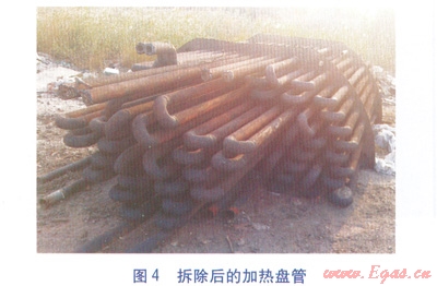 污垢樣品的化學(xué)分析結(jié)果表明,污垢主要為含油性碳酸鈣等鹽類污垢,并含有少量泥沙。對摻水進行檢測后發(fā)現(xiàn),水中油質(zhì)量濃度達70~150mg/L,還含有少量的泥沙。當(dāng)含油摻水在加熱盤管內(nèi)溫度不斷升高后,極易在加熱盤管內(nèi)壁形成污垢,造成加熱盤管管壁熱阻加大,介質(zhì)流動阻力增大,最終嚴重堵塞盤管,導(dǎo)致加熱爐無法正常運行。采用酸液清洗后,雖然加熱盤管的換熱能力有所提升,但由于加熱盤管內(nèi)摻水實際流速低(低于0.5m/s),且酸洗造成盤管內(nèi)表面粗糙,易結(jié)垢的因素并未消除,因此很快再次出現(xiàn)換熱效率下降的問題。
