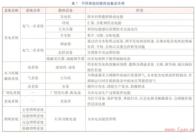 水電站發(fā)電工藝流程較復(fù)雜,涉及到的發(fā)電及配套輔助設(shè)備種類繁多,根據(jù)散熱設(shè)備的散熱機(jī)理及自身蓄熱特性,散熱設(shè)備可分為:重型水冷設(shè)備,蓄熱能力大,如發(fā)電機(jī)及水冷變壓器。重型風(fēng)冷設(shè)備,蓄熱能力較強(qiáng),如母線、風(fēng)冷變壓器等。輕型風(fēng)冷設(shè)備,蓄熱能力小,如燈具、電氣盤柜、電機(jī)等設(shè)備。其中,重型水冷設(shè)備大部分散熱量由設(shè)備自帶的水冷卻系統(tǒng)帶走,其余散熱量散發(fā)到廠房空間,重型和輕型風(fēng)冷設(shè)備全部散熱量散發(fā)到廠房空 間同系統(tǒng)(發(fā)電系統(tǒng)、水力機(jī)械輔助系統(tǒng)、廠用電系統(tǒng)、直流系統(tǒng)、照明系統(tǒng)等[1-4])的散熱設(shè)備及作用見表1。