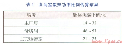 大型地下水電站廠房一般以主廠房、主變壓器室曲大洞室為中心,中間通過(guò)母線洞連接,形成龐大、復(fù)雜的地下洞室群。其中,主廠房分為發(fā)電機(jī)層、母線層、水輪機(jī)層、蝸殼層、廊道層等功能層。散熱設(shè)備的各分布場(chǎng)所分別見表2、3.以三峽地區(qū)某地下水電站各場(chǎng)所散熱功率比例進(jìn)行估算。