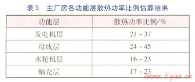 各洞室散熱功率比例估算結(jié)果見表4。由表4可知,母線洞的發(fā)電功率比例最大,主廠房與主變壓器接近。主廠房各功能層散熱功率比例估算結(jié)果見表5。由表5可知,母線層散熱功率比例最大,其次是發(fā)電機(jī)層,水輪機(jī)層與蝸殼層散熱功率比例接近且最小。