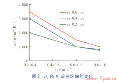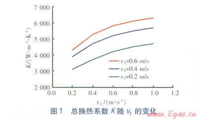 V1分別為0.2、0.4、0.6m/s時,由式(1)計算得到的總換熱系數(shù)K隨穢:的變化見圖1。由圖1可知,當(dāng)v1一定時,總換熱系數(shù)K隨v2的增大而增大,但增大的幅度在減小。