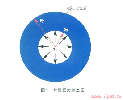 “地層 井眼”模型如圖5。地層可看作是半徑無窮大的圓,由圣維南原理[22]可知:無窮大地層半徑遠大于井眼半徑,因此由井壁應(yīng)力對無窮遠處的總應(yīng)力擾動是很小的,可以不計。由于水泥漿未凝固,故井壁僅受水泥漿液柱壓力(qo)的內(nèi)壓作用。