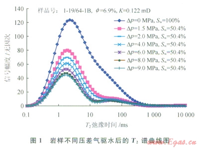 經(jīng)過成藏作用后,巖石孔隙中各類孔、喉中均有水的賦存,其賦存狀態(tài)受控于孔喉大小、形狀以及巖石表面物理性質(zhì)等[12],對(duì)于氣藏儲(chǔ)層來說,一般在細(xì)小孔喉處賦存的水較多。通過巖樣飽和水后進(jìn)行氣驅(qū)水和核磁共振實(shí)驗(yàn),分析了登婁庫組巖石中水的賦存特征。巖樣含水飽和度為100%時(shí)測(cè)試的核磁共振T2譜曲線反映的是孔隙內(nèi)全部水體積,曲線下包面積代表了巖樣的全部孔隙體積。在不同壓差氣驅(qū)水后(氣驅(qū)水過程的驅(qū)替壓差由小到大逐步增加),巖樣達(dá)到不同含水飽和度,隨著氣驅(qū)壓差的增大,巖樣含水飽和度降低,T2譜曲線下降(圖1),相鄰T2譜曲線之間的面積代表了兩條曲線對(duì)應(yīng)驅(qū)替壓力變化所引起的可動(dòng)流體變化量,因此由相鄰T2譜曲線之間的面積分布及大小可看出可動(dòng)水來自哪些孔隙及總量多少[13]。