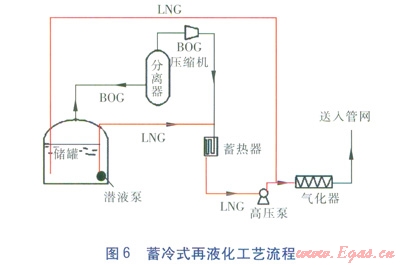 為了克服LNG夜間外輸量小導致所提供的冷量不足以將BOG再液化的問題,在以上基礎(chǔ)上發(fā)展了蓄冷式再液化工藝,流程見圖6。