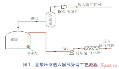該工藝流程簡單,設(shè)備少,可以節(jié)約造價,因此,在實際中被較多采用,比如日本大阪瓦斯和東京瓦斯公司等的LNG接收站的BOG處理就是采用了這種方法[8]。但是這種方法能耗大,受下游用氣量影響較大,適應(yīng)性不強,而且BOG所攜帶的大量冷能消耗于壓縮機的壓縮過程,未得到利用,造成了浪費。