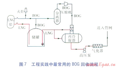 正常情況下,儲罐的日蒸發(fā)量(質(zhì)量比)大約在0.03%~0.08%左右,對于大型儲罐來說,這已相當可觀,對其進行回收可以帶來巨大的經(jīng)濟和社會效益。目前,BOG回收包括二方面內(nèi)容,一是對LNG氣化產(chǎn)生的天然氣進行回收,二是對BOG攜帶的冷量進行回收。