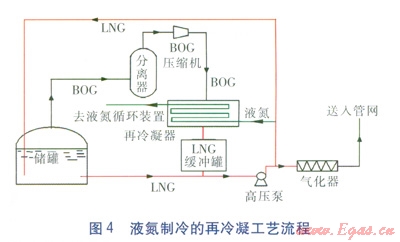 再冷凝過程中,采用外部制冷介質(zhì)(如液氮)提供冷量使BOG液化為LNG的工藝流程見圖4,液氮和丙烷是兩種比較常見的制冷劑[13-14]。