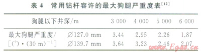 針對(duì)以上分析,根據(jù)常用的Æ127.0mm和Æ139.7mm鉆具曲線圖,反算出常用的鉆桿容許的最大井眼曲率如表4,可在現(xiàn)場(chǎng)使用參考。以此表格對(duì)比發(fā)生失效的4口井的情況(表2),可知其造斜點(diǎn)處的狗腿度均超過(guò)了容許限度,茍西003-Hl更是達(dá)到了6.24°/30m。