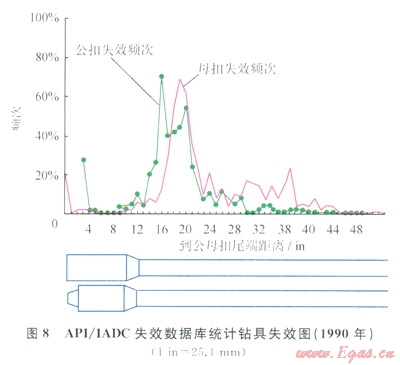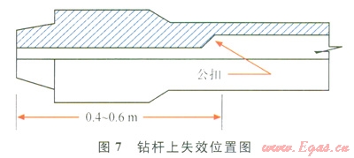 至于這種失效為什么往往發(fā)生在母扣接頭以下0.4~0.6m處,且剛好處于鉆具的加厚帶區(qū)域。追溯鉆桿生產(chǎn)工藝[10]便知:管體材質(zhì)、接頭和焊縫均已不是現(xiàn)代鉆桿生產(chǎn)的瓶頸,加厚帶及其附近位置已變?yōu)殂@具最主要的應(yīng)力集中點(diǎn),因而也是最易發(fā)生疲勞損壞的位置,API及IADC數(shù)據(jù)庫(kù)[11]顯示大多數(shù)鉆具的失效都發(fā)生在接頭兩端加厚帶的位置(圖7、8)。