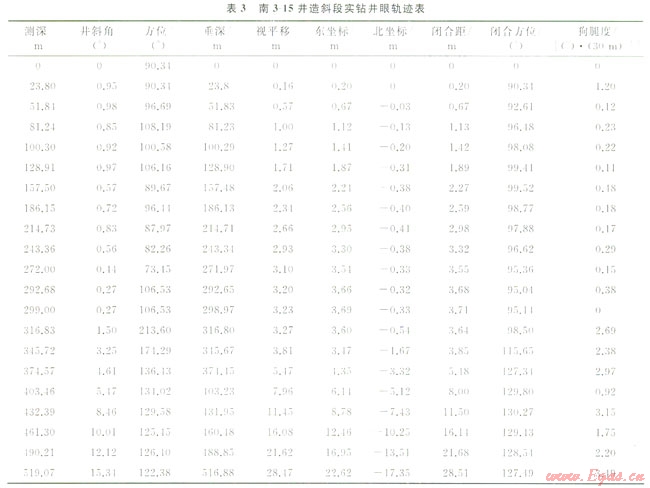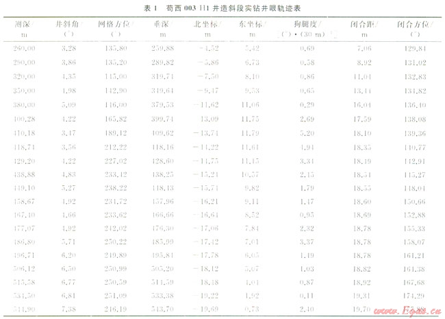 茍西003-H1井于2012年3月28日開鉆,從400m開始定向繞障,定向段400~624m,井斜由4°上升至12°,造斜段數(shù)據(jù)見表1。