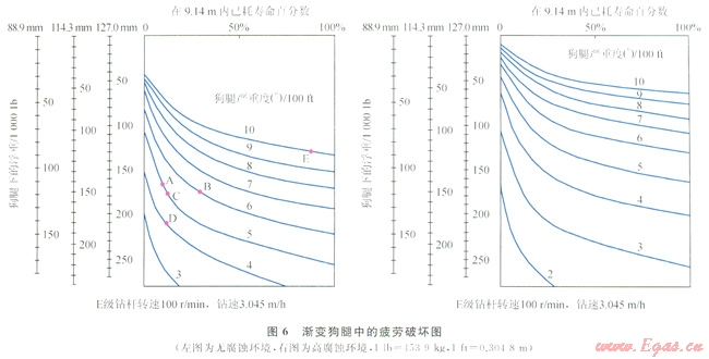 其后Hansford和Lubinski提出過(guò)一種簡(jiǎn)易的方法來(lái)估算鉆桿通過(guò)狗腿段后的累積疲勞損傷,定制了腐蝕介質(zhì)和非腐蝕介質(zhì)中E級(jí)鉆桿在不同狗腿嚴(yán)重度和拉力下消耗的壽命[9](圖6,參見GB/T 24956—2010《石油天然氣工業(yè)鉆柱設(shè)計(jì)和操作限度的推薦作法》第68頁(yè))。在不同轉(zhuǎn)速和鉆速情況下,可用下面公式進(jìn)行校正。