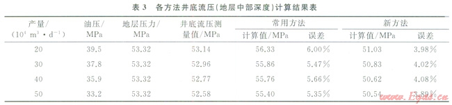 利用式(1)~(2)、(8)~(11)對(duì)普光B井的井筒壓力進(jìn)行計(jì)算,同時(shí)也利用常用的干氣井井底流壓計(jì)算公式[11]進(jìn)行計(jì)算,其計(jì)算結(jié)果如表3所示。