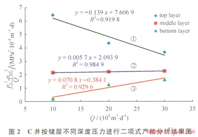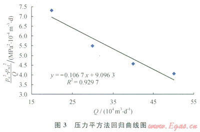 以普光B井為例,儲(chǔ)層中深5320m,儲(chǔ)層厚度442m,井底溫度130℃,井口溫度60℃,地層壓力53.32MPa,滲透率分布不均衡,滲透率相差大。各層厚度分布也不均勻,使得地層系數(shù)的分布也不均勻。其測(cè)試制度及儲(chǔ)層中部的井筒壓力測(cè)試值見表2。對(duì)表2中的4個(gè)測(cè)試制度中的儲(chǔ)層中部測(cè)試壓力及產(chǎn)量資料利用壓力平方法進(jìn)行回歸處理,其結(jié)果如圖3所示。