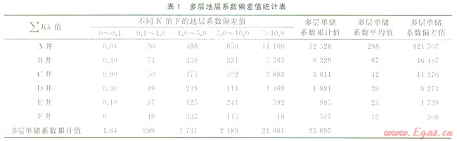 筆者定義多層地層系數(shù)累積值及多層地層系數(shù)偏差值來表示地層系數(shù)的差異性。多層地層系數(shù)累積值,即各層地層系數(shù)之和;多層地層系數(shù)偏差值,即地層系數(shù)方差值,用來衡量地層系數(shù)的波動(dòng)大小,方差值越大,表明地層系數(shù)波動(dòng)越大,非均質(zhì)性越強(qiáng)。表1為普光氣田5口井的地層系數(shù)偏差值。總體特征為:多層分布特征,各層滲透率差異大;多數(shù)井儲(chǔ)層縱向非均值性強(qiáng)、層數(shù)多,層間地層系數(shù)差異大。累積值為: