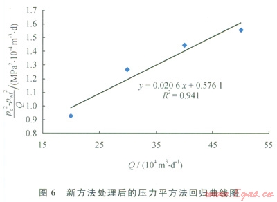 以普光B井為例來說明所建立的產(chǎn)能評(píng)價(jià)方法。首先,利用第2部分建立的井底流壓取值深度優(yōu)化方法,得出普光8井第8~11層的累積產(chǎn)能為總產(chǎn)能的1/2,即取第8層深度處的壓力為井底壓力;其次,利用第3部分的井筒壓力分布計(jì)算模型,計(jì)算出第8層的井底流壓;第三,對(duì)該井資料進(jìn)行處理,并進(jìn)行壓力平方法回歸,其結(jié)果見圖6。