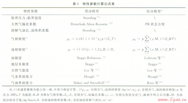 流體物性參數(shù)計(jì)算””是凝析氣井井筒壓降計(jì)算的基礎(chǔ)。目前主要包括:①黑油模型。通過(guò)優(yōu)選經(jīng)驗(yàn)公式計(jì)算溶解氣油比、天然氣偏差系數(shù)、天然氣體積系數(shù)等參數(shù)。②組分模型。通過(guò)狀態(tài)方程計(jì)算流體密度、黏度、界面張力等。筆者所采用的主要計(jì)算模型如表1所示。