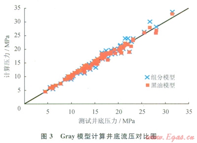 從統(tǒng)計(jì)誤差看,Gray模型各項(xiàng)最小(圖3),組分模型計(jì)算誤差略大于黑油模型。這是由于Gray模型的持液率計(jì)算過(guò)程中考慮了凝析油的反凝析現(xiàn)象,而組分模型再引入相態(tài)方程,使凝析現(xiàn)象疊加導(dǎo)致組分模型計(jì)算壓力較黑油模型對(duì)中性略差,誤差增加。因此推薦Gray模型按黑油模型計(jì)算凝析氣井井筒壓力。