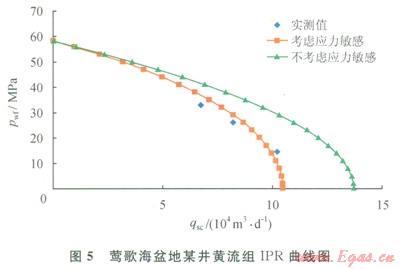 根據(jù)氣藏實際資料,計算得上覆地層壓力為61.0MPa,油藏壓力為58.2MPa,結(jié)合筆者推導(dǎo)的公式對產(chǎn)能進(jìn)行分析,其結(jié)果如圖5所示。從圖5中可看出,該氣藏應(yīng)力敏感效應(yīng)嚴(yán)重,應(yīng)力敏感效應(yīng)引起的氣井無阻流量損失在23%左右。從產(chǎn)能測試數(shù)據(jù)分析,考慮應(yīng)力敏感效應(yīng)的產(chǎn)能方程更符合實際產(chǎn)能測試。因此對鶯歌海盆地異常高壓氣藏在產(chǎn)能評價時應(yīng)考慮應(yīng)力敏感效應(yīng),綜合分析確定該氣藏單井合理工作制度,盡量減少應(yīng)力敏感效應(yīng)對單井產(chǎn)量造成的損失。