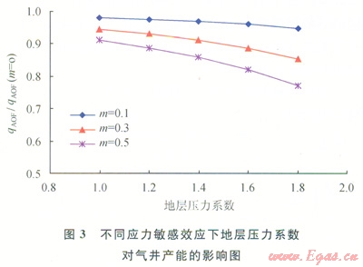 在油氣藏開發(fā)過中,儲層有效應(yīng)力可表述為上覆地層壓力與孔隙壓力之差,在一定的上覆地層壓力情況下,儲層有效應(yīng)力只與地層壓力有關(guān),儲層有效應(yīng)力將會隨著地層壓力系數(shù)變化而變化。如圖3所示,在同樣的生產(chǎn)條件下,地層壓力系數(shù)越大的氣藏(即越具有高異常壓力顯著特征的氣藏),開發(fā)過程中應(yīng)力敏感效應(yīng)將越嚴(yán)重,單井產(chǎn)能損失越大。
