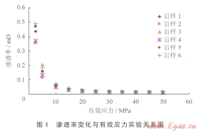 實驗結(jié)果如圖l所示,可見中新統(tǒng)黃流組儲層巖心對應(yīng)力具有強敏感性,當(dāng)有效應(yīng)力小于10MPa時,隨著有效應(yīng)力的增加儲層滲透率出現(xiàn)快速下降,即儲層應(yīng)力敏感性強,滲透率傷害指數(shù)大;但隨著有效應(yīng)力的進(jìn)一步增加,儲層滲透率下降幅度出現(xiàn)降低,尤其當(dāng)有效應(yīng)力增大到15MPa后,儲層滲透率隨有效應(yīng)力增加下降幅度將進(jìn)一步減小,儲層應(yīng)力敏感性較弱。