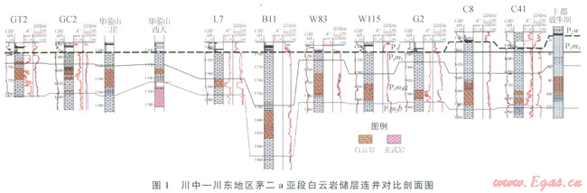 對川東、川中地區(qū)鉆揭中二疊統(tǒng)鉆井的鉆錄井資料重新梳理,系統(tǒng)研究巖心、巖屑、電測資料,并對中二疊統(tǒng)野外露頭剖面(華鎣山二崖剖面、西天剖面、李子埡剖面,豐都暨龍鎮(zhèn)烏羊壩剖面、放牛壩剖面,豐都武平大壩剖面)進(jìn)行仔細(xì)觀測,筆者發(fā)現(xiàn)[2],川東—中局部地區(qū)中二疊統(tǒng)茅口組茅二a亞段內(nèi)發(fā)育一套最厚為30m的白云巖、硅質(zhì)白云巖儲層(圖1)。