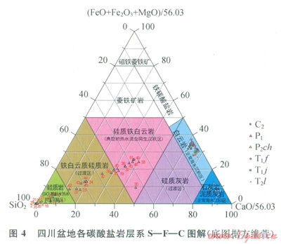 方維萱[7]提出S—F—C圖解。C端元(CaO)代表正常海水的沉積作用形成的碳酸鹽巖,S端元(SiO2)代表以SiO2為酸酐的熱水同生沉積作用形成的硅質(zhì)巖,F端元(FeO+Fe2O3+MgO)代表富Fe、Mg碳酸鹽型熱水同生沉積作用形成的菱鐵礦巖。川東地區(qū)所有中二疊統(tǒng)層狀硅質(zhì)巖、硅質(zhì)白云巖、白云巖樣品均落在硅質(zhì)鐵白云巖(典型的熱水混合同生沉積區(qū))、硅質(zhì)巖(SiO2酸酐型熱水同生沉積區(qū))及鐵白云質(zhì)硅質(zhì)巖(過渡區(qū))內(nèi),而四川盆地石炭系、長興組、飛仙關(guān)組、嘉陵江組和雷口坡組的樣品則落在正常海水沉積區(qū)(圖4)。S—F—C圖解顯示中二疊統(tǒng)層狀硅質(zhì)巖、白云巖、硅質(zhì)白云巖成因與其他層系的白云巖成因截然不同,為熱水成因。