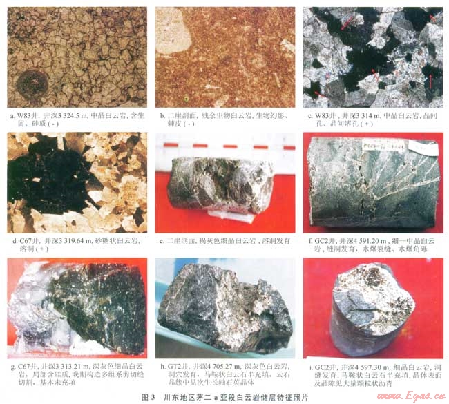 1)川東地區(qū)茅二a亞段發(fā)育一套層狀、硅質(zhì)白云巖儲層,厚度可達(dá)30m,儲層溶蝕孔洞縫發(fā)育,儲集性能好。