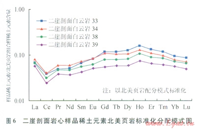 稀土元素能有效區(qū)分熱水成因沉積物與非熱水水成沉積的沉積物,前者REE總量低,Ce為負(fù)異常,Eu為正異常,HREE富集;后者REE含量高,Eu為負(fù)異?;驘o異常,HREE不富集[9-12]。川東地區(qū)多條野外露頭剖面(華鎣山二崖、華鎣山閻王溝、華鎣山仙鶴洞、石柱冷水溪)和鉆井巖心樣品白云巖(圖6,以華鎣山二崖剖面為例)的稀土元素北美頁巖標(biāo)準(zhǔn)化分配模式均可以看出,其沉積以熱水沉積為主,混有少量非熱水的水成沉積物。