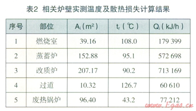 吳煤公司的天然氣改質爐是常壓改質爐,該工藝過程的熱效率76.37%,生產城市燃氣效率84.74%。對照國內常壓改質爐生產數(shù)據(jù),屬于較好水平生產燃氣。這種能源轉換設備不同于其他燃氣生產設備,無固體灰渣排出,因此,熱量損失評價可以從排煙熱損失(顯熱損失和化學不完全燃燒熱損失)及爐肇散熱損失進行考察。測試數(shù)據(jù)顯示,僅有部分爐體外壁溫度有所偏高,較易克服以減少熱量損失。從占熱量損失的比值來看分別為機械發(fā)生爐為45%,鍋爐為59.53%,天然氣改質爐為18.52%,由此可見,天然氣改質爐的能源轉換和熱量利用最好。