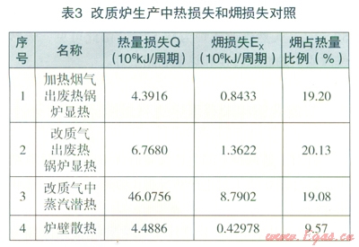 (2)從改質爐生產中熱損失和損失計算結果(表3)可見,無論是熱量損失還是火用損失,改質氣中蒸汽的潛熱損失和損失占極大部分。因此,在改質爐生產中節(jié)能的關鍵在于調節(jié)到最適宜的操作參數(shù),在滿足改質氣質量指標的情況下,盡可能提高水蒸汽分解率,可以提高操作溫度和降低水蒸汽與天然氣之比來實現(xiàn),從而降低改質爐生產中有效能(火用)損失。另外,在停產檢修時,盡量做好廢熱鍋爐的清掃工作,改善傳熱效果,盡可能降低加熱煙氣和改質氣出廢熱鍋爐的出Vl溫度,從而降低這兩部分的熱量損失和能量利用率。從爐體表面溫度測試記錄可知,燃燒室、蒸蓄爐、改質爐、過道的表面溫度分別為108.0℃、95.0℃、90.2℃、l26.6℃,這些表面溫度偏高,可以在停產檢修時考慮改善保溫材料的保溫性能,降低爐壁表面溫度,降低爐壁散熱損失,使熱量得到有效利用。