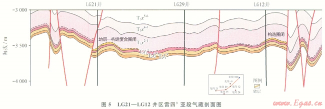 四川盆地雷口坡組大多數(shù)氣藏圈閉類型為構(gòu)造圈閉,根據(jù)雷四3亞段a小段地層、沉積微相、儲(chǔ)層對(duì)比分析、巖心物性分析和測(cè)井綜合解釋成果、綜合鉆井測(cè)試、氣水分布特征、地震儲(chǔ)層預(yù)測(cè)成果和構(gòu)造分析,認(rèn)為雷四3亞段氣藏圈閉類型較為復(fù)雜,在大型地層尖滅的背景上,受構(gòu)造、斷層和巖性變化影響,發(fā)育地層 構(gòu)造、巖性 構(gòu)造、構(gòu)造等多種圈閉類型(圖5、6)。