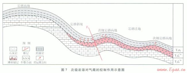 分析認(rèn)為,龍崗地區(qū)在晚三疊世沉積前古地理上,處于巖溶凹陷內(nèi),所以才使得a小段儲(chǔ)層得以保存,對(duì)保留下來(lái)的雷四3亞段a小段來(lái)講,還存在次級(jí)巖溶。在次級(jí)巖溶的微觀地貌上受構(gòu)造作用和斷層等因素的影響,形成了巖溶溝槽和巖溶殘丘、巖溶斜坡。殘留的a小段剝蝕尖滅帶附近為次級(jí)巖溶斜坡帶,是巖溶作用較強(qiáng)的區(qū)域,溶孔、溶洞較發(fā)育,且取心證實(shí)上覆碎屑巖充填較少,大部分溶孔、溶洞均得以保存。巖溶溝槽內(nèi)沉積了上覆烴源巖,與巖溶斜坡帶卜保存較好的儲(chǔ)集空間形成了良好的源儲(chǔ)配置[10-11],且在后期受構(gòu)造、斷層作用的影響下有利于天然氣的運(yùn)移和聚集,因此是尋找工業(yè)氣流井的最有利區(qū)(圖6)。