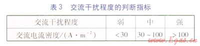 GB/T 50698—2011《埋地鋼質(zhì)管道交流干擾防護(hù)技術(shù)標(biāo)準(zhǔn)》中第3.0.5條規(guī)定:“當(dāng)管道上的交流干擾電壓不高于4V時(shí),可不采取交流干擾防護(hù)措施;高于4V時(shí),應(yīng)采用交流電流密度進(jìn)行評估。”高于4V時(shí)的交流干擾程度的判斷指標(biāo)參照GB/T 50698—2011《埋地鋼質(zhì)管道交流干擾防護(hù)技術(shù)標(biāo)準(zhǔn)》中3.0.6條(見表3)。
