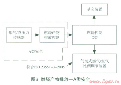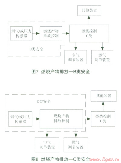燃燒產(chǎn)物排放控制功能可以分屬于A類、B類或C類安全,這與燃燒結(jié)構(gòu)及燃燒控制等安全相關(guān)系統(tǒng)有關(guān)。實例如圖6、7、8,從中可以看到分類的區(qū)別,總的原則是根據(jù)該功能失效產(chǎn)生的后果來評估。