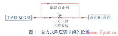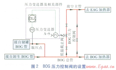 BOG壓力控制閥為氣動式薄膜凋節(jié)閥,設置于自力式降壓調(diào)節(jié)閥后、BOG總管的支管路上,進口與BOG總管連接,出口與放空主管連接,取壓點設置在BOG壓力控制閥前儲罐BOG管上,當取壓點壓力達到設定值時,閥門開啟,實現(xiàn)少量放散。BOG壓力控制閥的設置見圖2(圖2中EAG指安全放散氣體)。