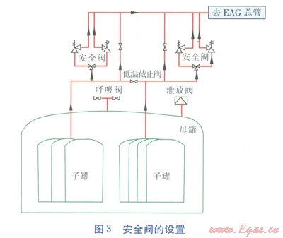 安全閥為機械式,設置于子罐的BOG管道上,開啟壓力為0.66MPa,回座壓力為0.54MPa。當儲罐出現(xiàn)故障,產(chǎn)生大量蒸發(fā)氣,自力式降壓調(diào)節(jié)閥和BOG壓力控制閥均全部開啟,仍不能穩(wěn)定儲罐壓力,儲罐氣相壓力升高至0.66MPa時,安全閥開啟,與BOG壓力控制閥、自力式降壓調(diào)節(jié)閥聯(lián)合放空,當儲罐壓力下降至0.63MPa時,BOG壓力控制閥關閉;壓力降至0.6MPa以下時,自力式降壓調(diào)節(jié)閥關閉;壓力降低至0.54MPa時,安全閥關閉。在放散過程中,站控系統(tǒng)發(fā)出聲光報警信號,通知生產(chǎn)維修人員進行搶修。安全閥的設置見圖3。