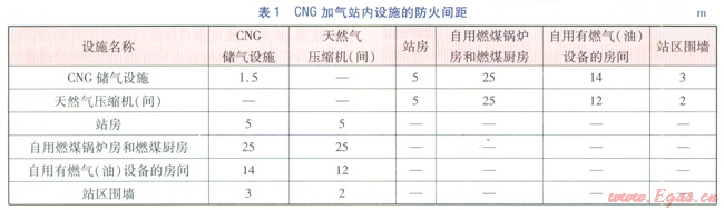 按規(guī)范GB 50156—2012中表5.0.13-1的規(guī)定,CNG加氣站內(nèi)設(shè)施的防火間距見表1。