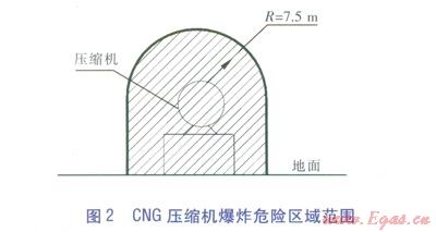 查看規(guī)范GB 50156—2012附錄C爆炸危險區(qū)域圖,露天設(shè)置的CNG儲氣瓶組、CNG壓縮機(jī)的爆炸危險區(qū)域范圍見圖1、2,圖中陰影部分表示爆炸危險區(qū)域(2區(qū))。