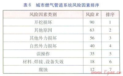 根據(jù)事故發(fā)生的可能性和后果評分結(jié)果,按照式(1)進行計算,城市燃氣管道7類常見風險因素排序見表6。