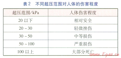 由沖擊波一沖量準(zhǔn)則確定的不同超壓范圍對(duì)建筑物的破壞程度、人體的傷害程度分別見表1、2。