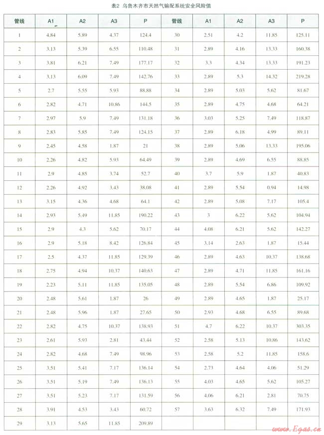 根據(jù)風(fēng)險評估方法,計算出烏魯木齊市57條滅然氣管道的風(fēng)險值(表2)。由表2可知,管網(wǎng)脆弱性指標(biāo)以1號管線最大,為4.84,其次是51號管線,為4.70,主要是因為管線管輸氣體壓力大,管線使用年限較長,19號管線管輸氣體壓力小,最小埋深大管網(wǎng)脆弱性指標(biāo)最小,為2.23。事故誘因指標(biāo)以57號管線最大,為6.32,其次是51號管線,為6.22,主要是因為建筑施工、地面活動情況和供水、排水沒施建設(shè)活動較頻繁,15號管線位于郊區(qū),外界干擾少,事故誘因指標(biāo)最小,為2.63。事故后果指標(biāo)以3,號管線最大,為14.32,其次是38號管線,為13.33,主要是因為燃?xì)夤芫W(wǎng)位于居住區(qū)、商業(yè)區(qū)內(nèi),人口密度和財產(chǎn)密度較高,泄漏危害嚴(yán)重;41號管線位于人煙稀少地區(qū),事故后果指標(biāo)最小,為0.94。全部管網(wǎng)風(fēng)險平均值為112,1條天然氣管道風(fēng)險評估值大于300,說明有較高的風(fēng)險;2條天然氣管道風(fēng)險評估值在200~300之間,說明風(fēng)險一般;54條天然氣管道風(fēng)險值小于200,說明相對安全。綜合以上,由于管道周圍運(yùn)行環(huán)境不同,其風(fēng)險也是不一樣的,51號管段的脆弱性指標(biāo)、事故誘因指標(biāo)和事故后果指標(biāo)較大,知此管段的風(fēng)險等級較高。