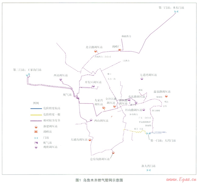 烏魯木齊城市燃?xì)夤芫W(wǎng)經(jīng)過十幾年的規(guī)劃、改造、建設(shè),形成了現(xiàn)在的燃?xì)饩W(wǎng)絡(luò)(圖1),烏魯術(shù)齊市天然氣覆蓋區(qū)域逐漸從以天、沙、新、水、米東5個主城區(qū)為主,延伸至頭屯河區(qū)、達(dá)坂城等城郊區(qū)域,已全面實現(xiàn)氣化目標(biāo),成為首個率先實現(xiàn)全面“氣化”的省會城市。