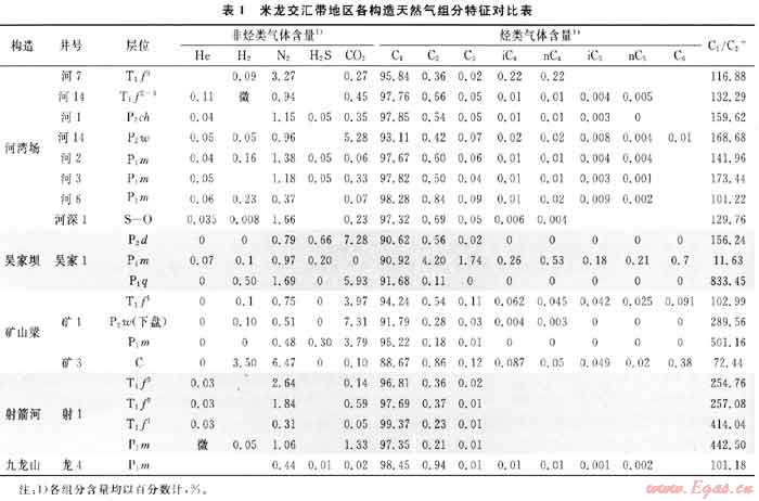 該區(qū)儲(chǔ)層較川西北部地區(qū)取得產(chǎn)能的中三疊統(tǒng)雷口坡組(中壩)和上三疊統(tǒng)須家河組(中壩、九龍山)層位老,埋藏深,從鉆探情況看,下古生界儲(chǔ)層埋深較大,一般在4500m左右。河灣場(chǎng)氣田為多烴源、多儲(chǔ)層、多產(chǎn)層的復(fù)合型氣田[1],前人對(duì)其深層天然氣成因和氣源還未做過(guò)系統(tǒng)研究。為此,筆者分別根據(jù)天然氣組分、天然氣碳同位素以及天然氣濃縮烴特征來(lái)研究該區(qū)各層位深層天然氣氣源。