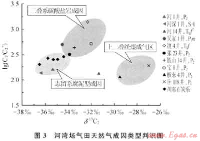 沈平(2005)根據(jù)天然氣乙烷碳同位素特征,將四川盆地海相地層天然氣劃分為3種類型。第一類是δ13C1<-34.0‰,最輕為-37.0‰左右(如福成寨石炭系),川東絕大部分石炭系,尤其是川東北地區(qū)基本屬于這一類。王廷棟等(1994)曾利用儲(chǔ)層瀝青和氣體地球化學(xué)特征綜合判斷為志留系腐泥型烴源巖成因。第二類是δ13C2>-30.0‰,如典型的煤成氣板東4井P22和臥龍河部分下二疊統(tǒng)天然氣,前人研究表明它們主要屬于上二疊統(tǒng)龍?zhí)督M煤系有機(jī)質(zhì)成因(楊遠(yuǎn)聰?shù)龋?989;王廷棟等,1994;鄭永堅(jiān),1995;王蘭生等,1997)。第三類δ13C2介于-34.0‰~-30.0‰,主要分布在川東北二疊系和下三疊統(tǒng)飛仙關(guān)組中,在平面上環(huán)開(kāi)江-梁平海槽分布或直接分布在開(kāi)江-梁平海槽中,該類氣體碳同位素組成特征與來(lái)源于志留系的腐泥型天然氣和來(lái)源于上二疊統(tǒng)龍?zhí)督M煤成氣(腐殖氣)明顯不同。河灣場(chǎng)氣田奧陶系、二疊系地層天然氣δ13C1介于-35.65‰~-35.40‰,δ13C2介于-35.35‰~-36.34‰,乙烷碳同位素明顯低于-34‰,具有典型的腐泥型天然氣特征。與此同時(shí)該區(qū)天然氣乙烷碳同位素與川東和川東北地區(qū)二、三疊系天然氣存在明顯的差別,明顯偏輕。河灣場(chǎng)氣田乙烷碳同位素與川東北地區(qū)石炭系天然氣乙烷碳同位素大致相當(dāng)(表2、圖3)。其相同或者相近的乙烷碳同位素特征預(yù)示它們有著相同的來(lái)源。