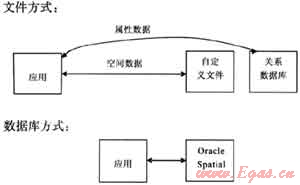 在這兩種方式中間形成了一種過渡方式:即建立一個(gè)同關(guān)系數(shù)據(jù)庫的中間處理平臺,比如MapInfo的SpatialWrae產(chǎn)品,通過它將空間數(shù)據(jù)庫存放在關(guān)系型數(shù)據(jù)庫中。