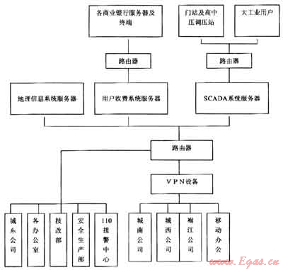 硬件網(wǎng)絡(luò)以地理信息系統(tǒng)服務(wù)器、用戶收費(fèi)系統(tǒng)服務(wù)器和SCAD系統(tǒng)服務(wù)器為核心,采用一條50M和一條8M專用光纜與電信運(yùn)營商連接,50M光纜分兩區(qū),其中16M帶寬用于收費(fèi)服務(wù)器與8家聯(lián)網(wǎng)收費(fèi)銀行聯(lián)系傳遞信息,34M帶寬用于辦公網(wǎng)絡(luò)上互聯(lián)網(wǎng)和燃?xì)饩C合管理系統(tǒng)、用戶收費(fèi)系統(tǒng)、SCAD系統(tǒng)通過VPN設(shè)備與遍布市區(qū)的東南西北四個(gè)分公司及營業(yè)服務(wù)廳聯(lián)網(wǎng)。8M光纜專門用于與各SCAD系統(tǒng)遙測遙控點(diǎn)數(shù)據(jù)傳輸和與集團(tuán)公司SCAD控制中心數(shù)據(jù)交換(通過互聯(lián)網(wǎng))。