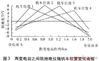 雜散電流的變化與雜散電流源的變化具有一致性,軌交雜散電流的大小隨軌交系統(tǒng)的用途、機(jī)車的相對位置和運(yùn)行狀態(tài)不同而變化。機(jī)車在每兩個(gè)站臺之間都要經(jīng)歷加速、勻速、減速的過程,不同運(yùn)行狀態(tài)下機(jī)車電流不同。隨機(jī)車電流及機(jī)車位置的變化,軌道電流和軌道對地電位(簡稱軌地電位)也處于變化中,圖3為兩變電站之間軌地電位隨機(jī)車位置變化曲線。軌地電位為正時(shí),雜散電流流入大地,軌地電位為負(fù)時(shí),雜散電流返回鋼軌。鋼軌泄漏電流位置的變化使得埋地管道對地電位(簡稱管地電位)處于不斷變化之中,管道發(fā)生雜散電流腐蝕的位置和強(qiáng)度也在不斷變化[8]。