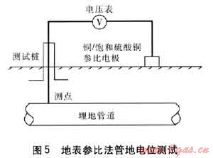 土壤和管道中有電流流過時(shí)總會(huì)引起電位的變化,通過管地電位偏移可以對雜散電流影響進(jìn)行判定。管地電位指埋地燃?xì)夤艿琅c對應(yīng)參比電極之間的電位差。根據(jù)參比電極位置不同有直接參比法、地表參比法、近參比法、遠(yuǎn)參比法等。地表參比法管地電位測試接線見圖5。對于管地電位波動(dòng)頻繁地區(qū),可采用電子記錄儀表代替?zhèn)鹘y(tǒng)電壓表,引申為管地電位連續(xù)監(jiān)測法。